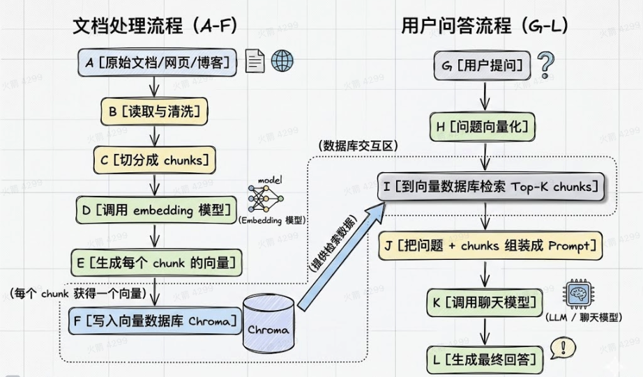 我后来真正开始理解 RAG,是因为把它拆成了两个阶段看: